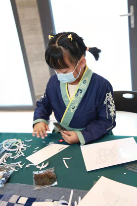 活动以剧本沉浸式,寻找丢失的七彩羽毛为背景展开。在袅袅青烟、悠悠古琴声中,孩子们身穿汉代服饰,彬彬有礼、诵读古词。通过相互帮助、协力合作、寻找线索、勇闯关卡,最终完成任务。在npc(老师)的带领下,孩子们通过非遗羽毛画的技艺将七彩羽毛制作成精美的羽毛画作。